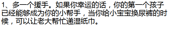 2、榜样的力量。你的大孩子已经能够成为小孩子模仿的对象,并从中受益无穷。老大可以按照你给他制定的规矩来约束小的,并且在从小到大的很多事情上都成为老二的坐标。