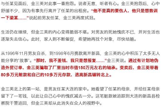 金三英:人不可能两次踏进同一条河,那件事情我也没有再次选择的机会。但是,自始至终我都知道当年携款出逃是错的,所以离开新昌时,我没有把赃款给父母用,我不想他们因我受牵连。