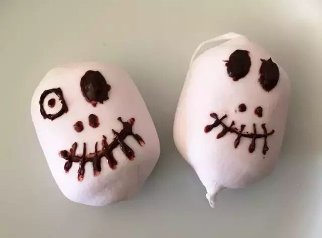 黑、白巧克力分别融化(微波炉40秒即可),用牙签或是小叉子画出蜘蛛的腿、眼睛。