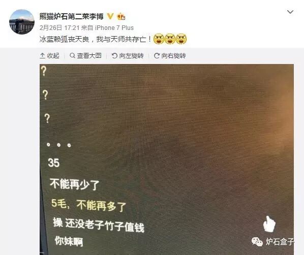 愤怒的李天师最终在微博发出冰蓝飞狐“丧天良”的感慨,并表示他不会罢休的。