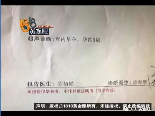 夏先生:“她就先在家里,用试纸,试了下,两个红杠了。感觉怀孕了,就去邵逸夫,先做了血液,诊断是可疑的,然后就做了一个B超,诊断书上面写的是怀孕约五周,按这个时间推算,医生断定7月11号就已经怀孕了。”