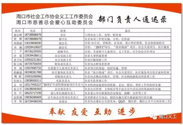 地址:周口市七一路邮政局家属院周口义工协会办公室