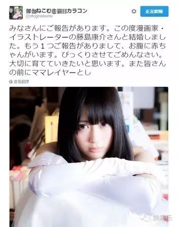 御伽ねこむ是绫濑遥,石原聪美的师妹,隶属同一家经纪公司,还没跨入戏剧圈已经威名远播,19日才上节目被女星森川葵掀裙子、摸胸部,让观众大喷鼻血,才隔10天就变人妻,更令大批粉丝心碎。而她在推特发文「抱歉让大家吓了一跳」连爆结婚、怀孕两大喜讯,令众人措手不及,她透过所属公司表示,未来不会引退,生产后仍会继续参加COSPLAY活动。