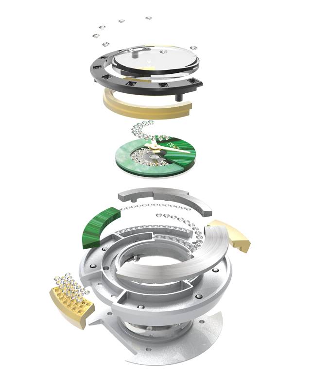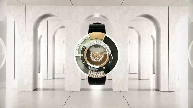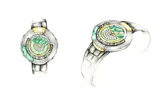 而最近,Delfina又应邀为Fendi设计了高级珠宝腕表Policromia。Policromia这个词源于希腊语,是poly(丰富)与khrôma(色彩)的结合,而这款腕表的整体观感也的确围绕着这两个词展开。
