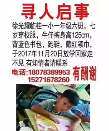 11月20日下午4点左右学校放学,桂林临桂的7岁男孩徐光耀离开学校,自己走路回家。但是家人迟迟没有等到孩子回来,光耀爸爸徐某和妻子分居,光耀跟着爸爸生活。