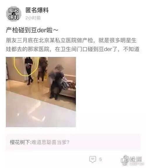 刚刚猜想的怀孕音讯好像很快就被证明,有网友给媒体爆料称,在某妇产科门前遇到豆得儿,疑似产检。