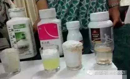 无限极钙片(左)和他公司钙镁片(右)的产品演示对比图!液体是白醋,模拟胃酸。
