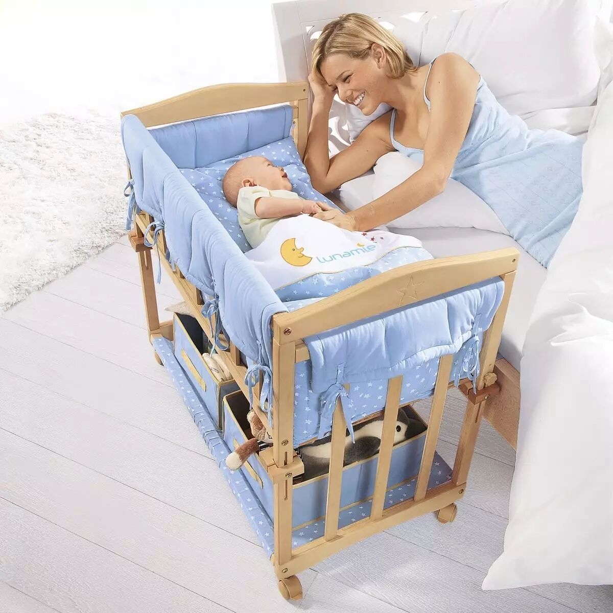 一种是美国式的婴儿床,有尿布台,有可以放在大床上的小床,还有玩乐空间。这种婴儿床优点显而易见,但是缺点是尺寸非常小,可能到一岁就睡不下了。