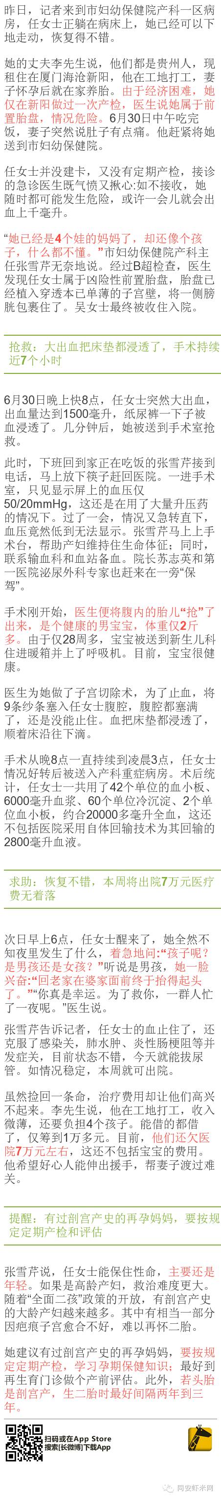 怀孕7次,流产3次,这是第4次剖宫产……近日,24岁产妇任女士因为并发凶险性前置胎盘,手术中出血2万多毫升,几乎相当于全身的血液换了四遍。经过医生近7个小时的抢救,终于将她从死神的魔爪中救回。她也是厦门市妇幼保健院有史以来出血量、输血量最大的产妇。