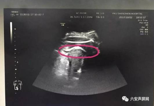 ▲红色圆圈处是胎儿的腿,已经伸到子宫壁外