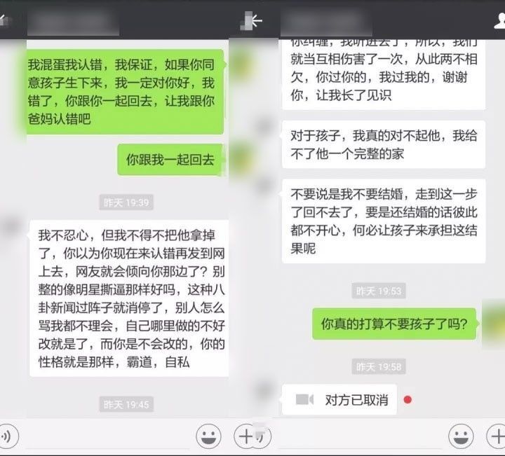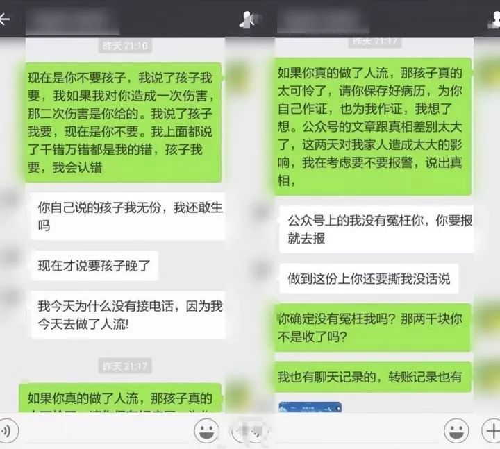 女主两次和我说她已经去了医院做人流,第一次是你们在公众号看到的,她去医院后心软了,没做。第二次是公众号发文后我联系她,她告诉我已经把孩子做了人流。在此前她并没有为我流产过一次,那是因为公众号聊天记录排版的问题,引起的误会,我没有让她流产过一次。里面那句:“你之前流产你父母知道吗?”实际上是指她第一次骗我说做了人流的那个时候。聊天记录中还有一句“自己做好结婚后的生活准备”,这句话意思并非要在婚后虐待她,而是提醒她婚后没钱可以给她过上好日子,要有心理准备。由于图片实在太多,我就不放图了,女主爆料的图里面有。