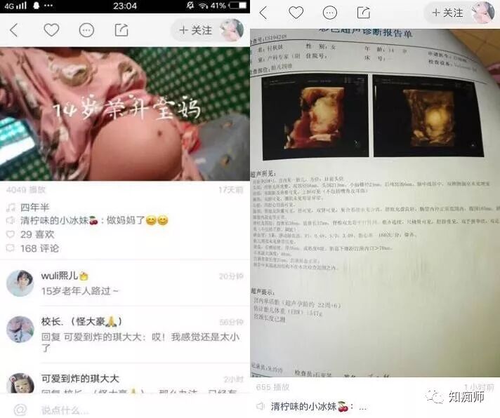 该女主播还发布了自己的诊断报告单,报告单显示年龄14岁,超声孕龄约22周+6。