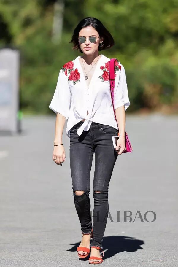 小个子美妞露西·黑尔 (Lucy Hale) 穿白衬衫+深灰色牛仔裤清爽耐看,肩头铺开的花朵刺绣成为点睛之笔。