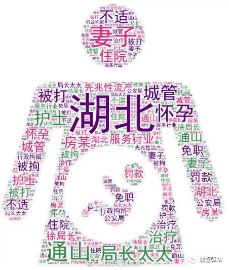 从上图可以看出,“湖北”、“通山”、“局长太太”、“护士”、“怀孕”等成为此次事件的舆论热词。@医学界网站于12月9日发帖《突发!局长太太将怀孕护士踢流产,局长说“你做服务行业的就要受得住气”》,主要内容是说明事件的始末,并附加了部分事发的图片,引起大量网民转发。城管局长太太身份、其行为的恶劣性以及事后城管局长的不当言论成功将“湖北”、“通山”、“局长太太”等词推上舆论热搜词,同时作为当事人房某丈夫的城管局长,该不该被免职,在舆论场还引发了一波热议。