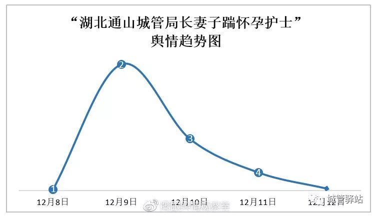 简介:2017年12月8日,湖北通山县一女子房某带儿子在通山县人民医院输液,与护士发生口角后,脚踢怀孕护士。事后,护士被诊断为先兆性流产,目前在医院保胎。相关视频被传上网后,有网民认出房某是城管局局长徐某的太太。并有该医院工作人员称,当天下班后徐某也到医院看望被打护士,并说“我老婆是东北人,她脾气大”“你是做服务行业的,服务行业就是这么难的,要受得了气”之类的言语。截至目前,通山县县委已免去徐某城管局长职务,违法行为人房某被行政拘留12天、罚款500元。相关舆情量在12月9日达到高峰。