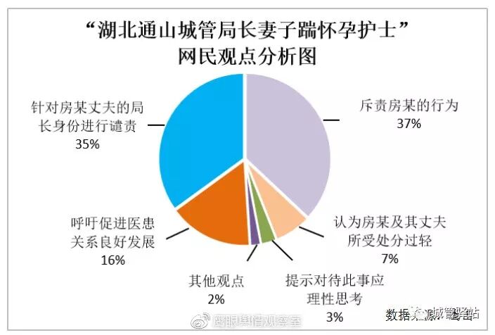 有关“湖北通山城管局长妻子踹怀孕护士”的消息在网络曝光后,迅速引发网民关注并讨论。37%的网民对踹人者房某进行强烈谴责,@全球头条新闻大爆料、@澎湃新闻、@北京青年报等发布了关于“城管局长夫人踹怀孕护士并被行政拘留”的消息,引发网民关注和讨论;@医学界网站、@今日头条大热门、@这个我服等发布了有关“局长太太将怀孕护士踢流产,局长说‘你做服务行业的就要受得住气’”的消息并被大量转发和评论,并迅速点燃了网民的愤怒情绪,网民纷纷谴责房某的行为。