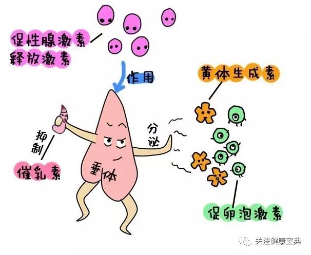 促性腺激素释放激素(GnRH)刺激脑垂体分泌:黄体生成素(LH)和促卵泡激素(FSH),而抑制垂体分泌:催乳素(PRL)。
