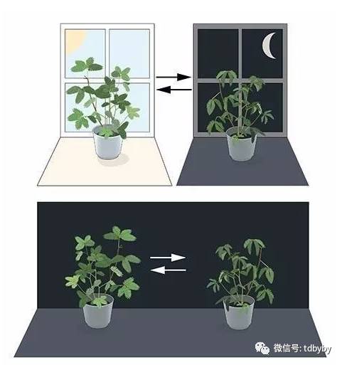 图片下半部分,把含羞草放在持续黑暗的地方(残忍的科学家!),含羞草体内的生物钟依旧发生作用,在白天时间打开,晚上照常关闭。(含羞草赢了!)