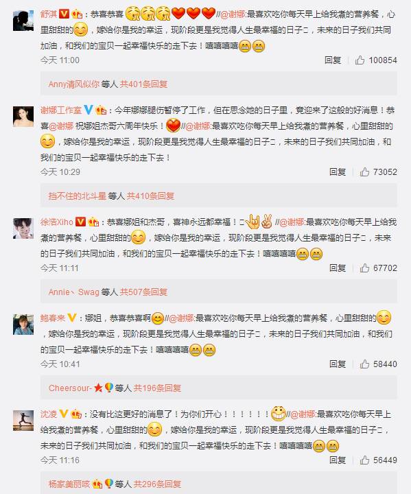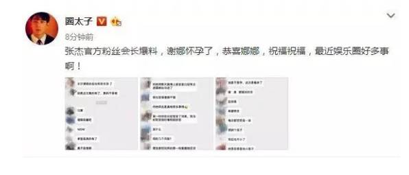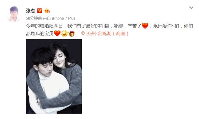 张杰在结婚六周年纪念日这天发微博公布了谢娜怀孕的喜讯!