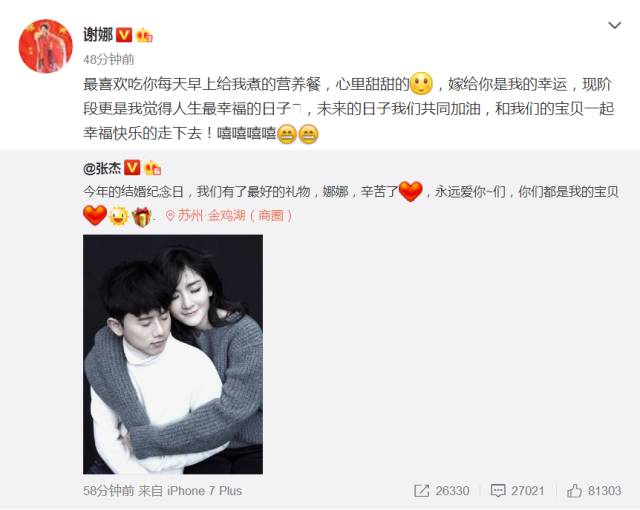 随后,谢娜也转发了张杰的这条微博并说了一段超级甜蜜的婚姻生活感言: