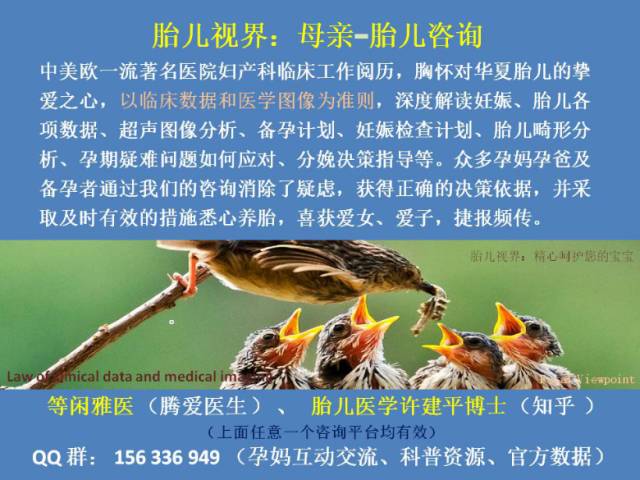 源自于 以临床数据和医学图像为准则(Law of clinical data and medical imaging)的胎儿医学及妇产科学科普平台和团队。胎儿视界团队在每次收到孕妈孕爸的咨询请求后,对孕妈孕爸提供的每一张图片、每一份报告、每一个数值都要花费专门的时间进行科学的计算、分析和评估,而不是简单粗暴的几句话、几分钟的打发。一对一的为孕妈孕爸解读他们的问题,给出建议并撰写正式的科学分析报告和推荐指导。本篇故事乃感恩季节本周胎儿视界成功案例之一,用于介绍我们的工作程序和成绩,感谢胎儿视界的客户、粉丝、读者,感谢我们的团队! 值此感恩节捷报频传之际创作,完成于2017年11月28日,版权所有,转发须注明来源及作者。胎儿视界以30多年的海内外的临床经验,竭诚为孕妈提供咨询服务。
