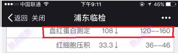 图二、血液常规手机报告截屏,显而易见,下行箭头表明孕妇有贫血,右侧数值为正常对照,通常为孕期常见,亦容易被忽略。