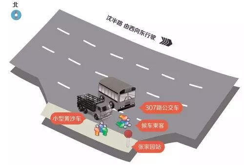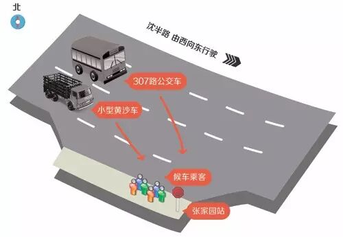 据目击者介绍,上午9点左右,一辆安徽牌照的黄沙车行驶将要经过张家园公交车站,这时一辆公交车307路和一辆黄沙车并排驶来。公交车在黄沙车的外侧,当靠近张家园公交车站时,公交车准备靠站,而黄沙车冲入车站台,导致事故发生。
