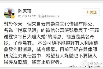 网曝今天王菲谢霆锋正在大理结婚呢…