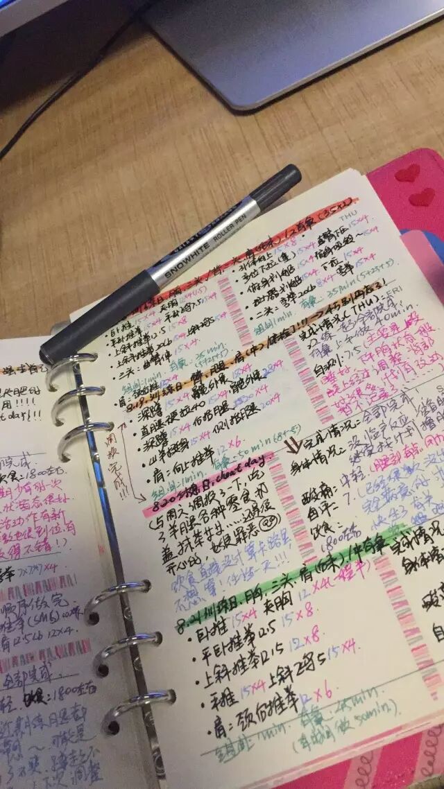 从最简单的跑步,到逐渐深入健身房的器械运动,“兔妈”都会用本子记录下自己的每一点进步和每天的健身安排 ▼