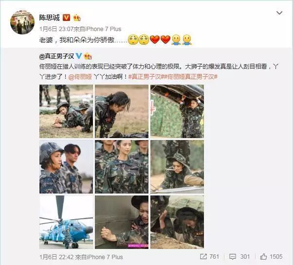 如今还在哺乳期的佟丽娅参加《真正男子汉》的录制,陈思成也多次通过微博表达对妻子的支持。1月6日,陈思成还转发微博,并示爱妻子佟丽娅:“老婆,我和朵朵为你骄傲……”