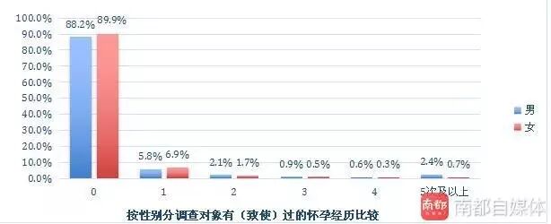 调查发现,女生10.1%有过怀孕经历,男生中11.8%曾造成对方怀孕。报告自身或伴侣有过人工流产经历,占发生过性行为的调查对象的9.9%.其中,有“重复人工流产”经历的约占四分之一,7.8%曾经历“3次以上人工流产”。