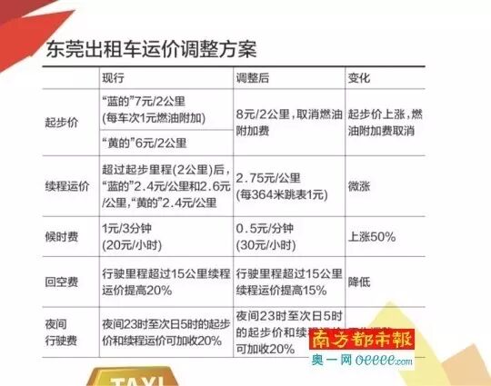 昨日,东莞市发改局发布公告称,将取消现行出租汽车燃油附加费,统一东莞市各类出租汽车运价。出租车的起步价、续程运价、候时费都会上涨,起步价统一调整为8元/2公里。