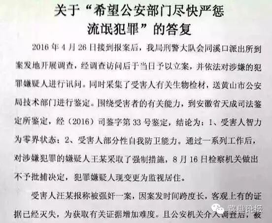 当天下午,休宁县公安局就此回应,称2016年4月26日接到报案后,休宁警方刑警大队会同溪口派出所到案发地开展调查,经调查访问后于当日就予以立案,并依法对涉嫌的犯罪嫌疑人进行讯问。同时采集了被害人有关生物检材,送黄山市公安局技术部门进行鉴定。围绕被害者的有关能力,到安徽省天成司法鉴定所进行鉴定,经鉴定,结论为被害人智力为临界状态;被害人部分性自我防卫能力。通过一系列工作后,对涉嫌犯罪的嫌疑人王某采取了刑事强制措施。今年8月16日,休宁县人民检察院依法作出不予批捕决定,犯罪嫌疑人现变更为监视居住。