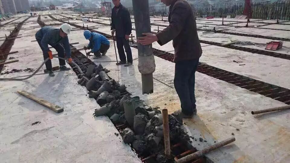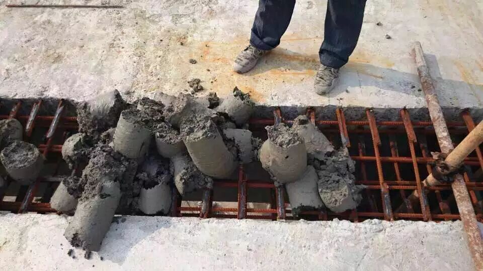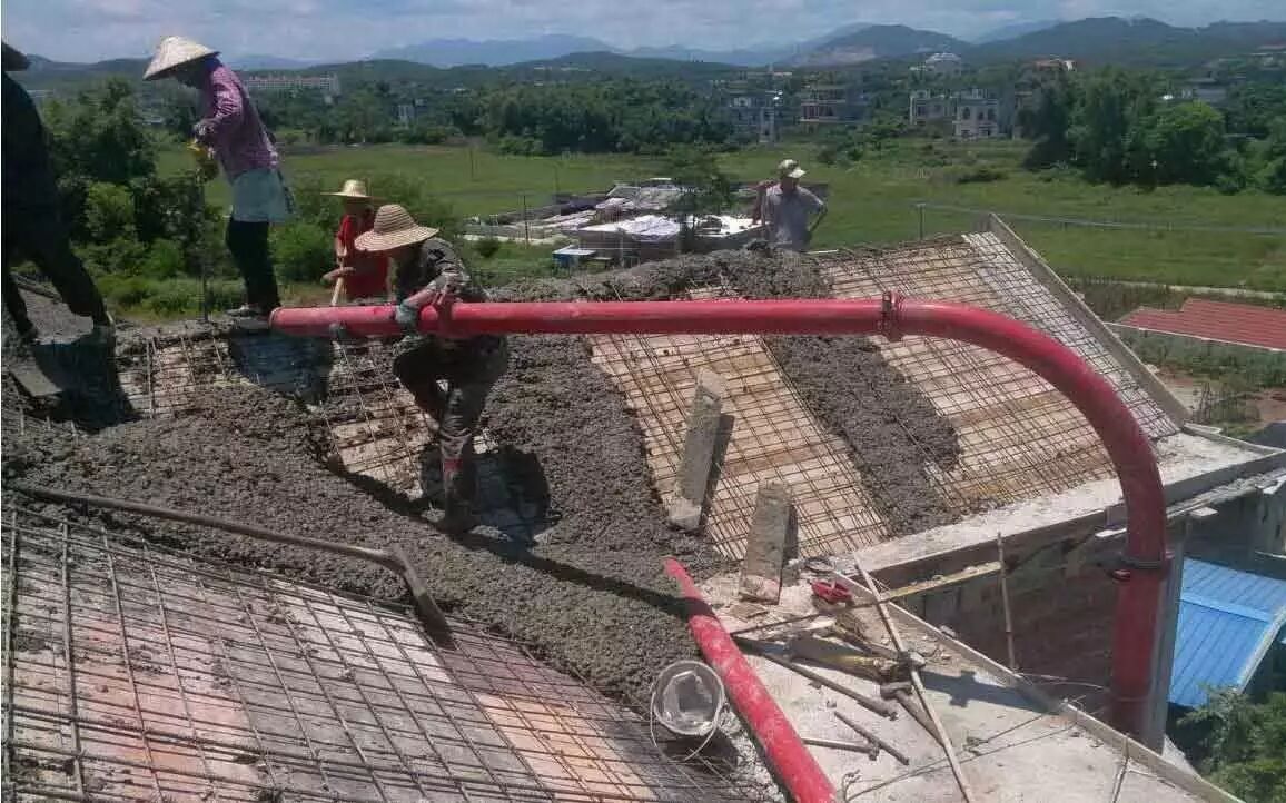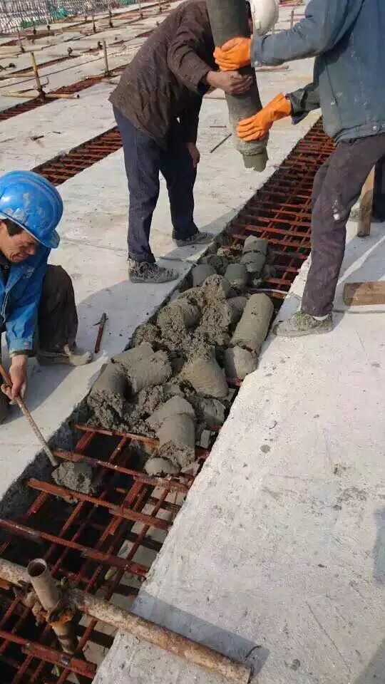 由于骨料不标准,加上刚开始的操作不熟练,比较容易产生堵管现象。标准的泵送石子为1-3cm,沙子以中沙为宜,向上泵送时尽量减少弯管以减少泵送压力,向下泵送时尽量减少垂直向下以免水分流失而增加堵管的可能性,操作手注意观察搅拌机出料的情况及时进行调整,防止过干的混凝土。