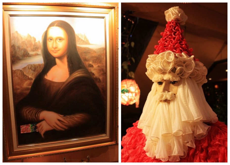 看一看,墙上挂的蒙娜丽莎也是手拿套套,熟悉的圣诞老人也是身披各种套套……越是开放的地方,在时尚的同时,却也十分注重健康、安全,内心强大的人还会勇敢宣扬预防艾滋病的公益事业。