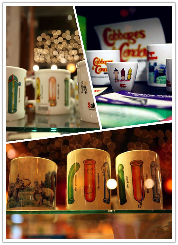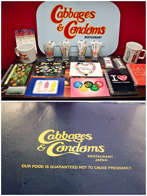 【看菜色,这里的盘子、碗,都有condom(避孕套)的标识。】