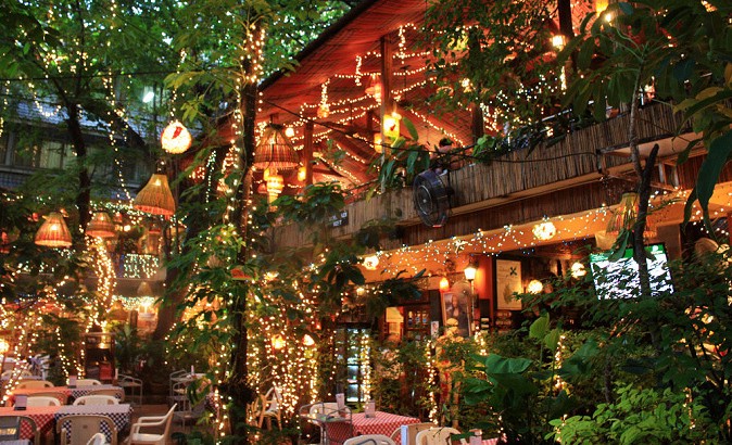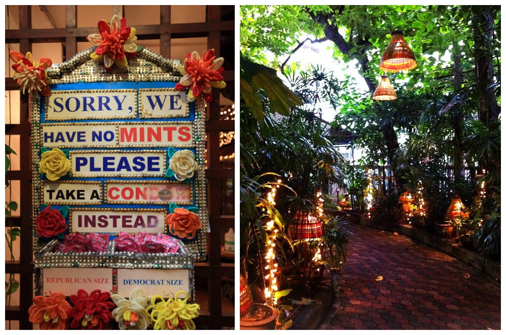 餐厅门面看上去并不大,一进门就看见门口牌子上写着:对不起,我们没有口香糖,请自取安全套。里面是个小院,走进去要穿过一条绿树丛生的小道,点点灯光让浪漫诗意气息扑面而来。