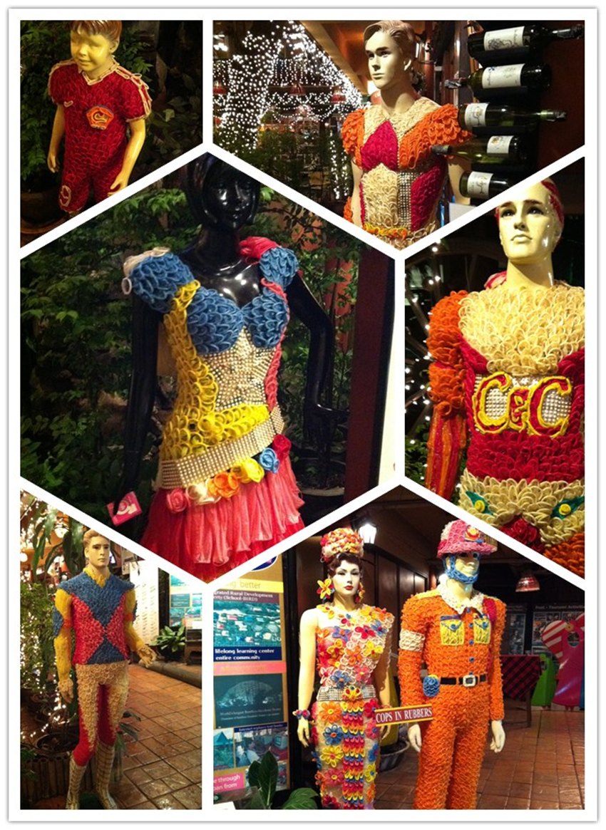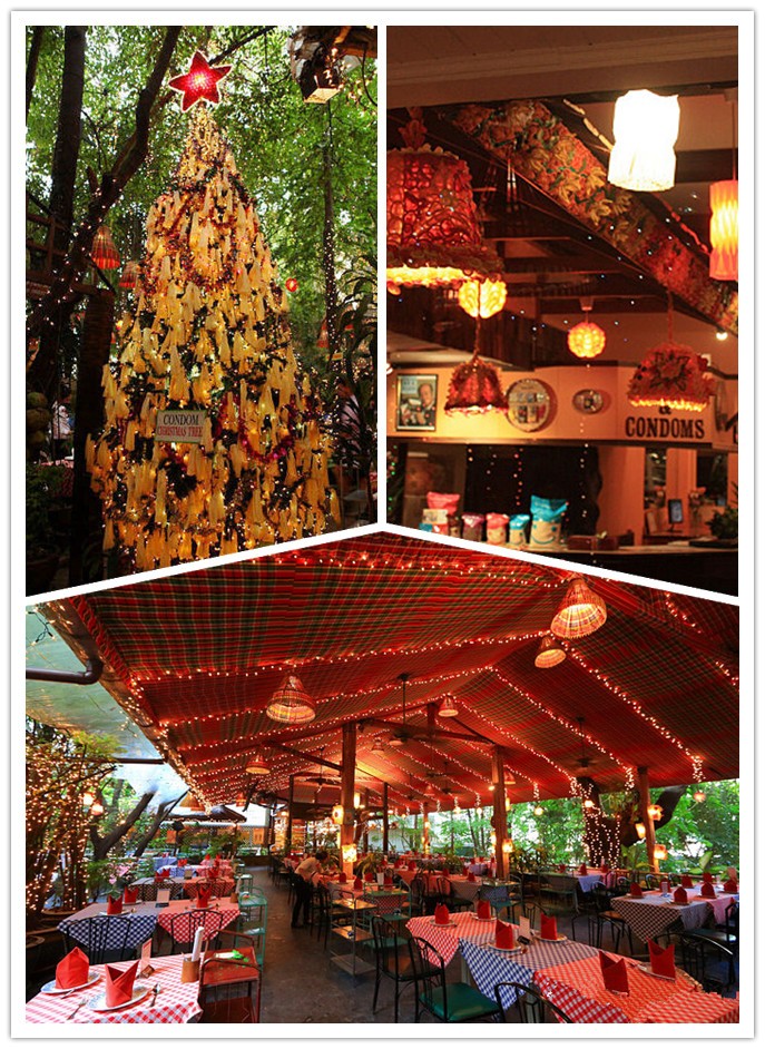 初来乍到,放眼望去,这家餐厅看上去并没什么不同,但近看后就会惊爆你的眼球:很多东西都是用套套作为原材料设计的。在感叹泰国人如此勇敢的生活态度之外,我们不仅心生疑问:到底是谁开了这样一家奇特的餐厅呢?难道他对安全套有特殊的收藏癖吗?