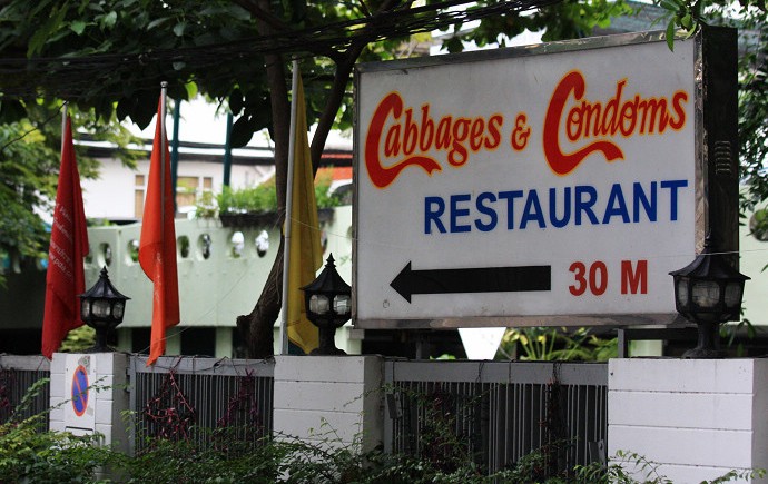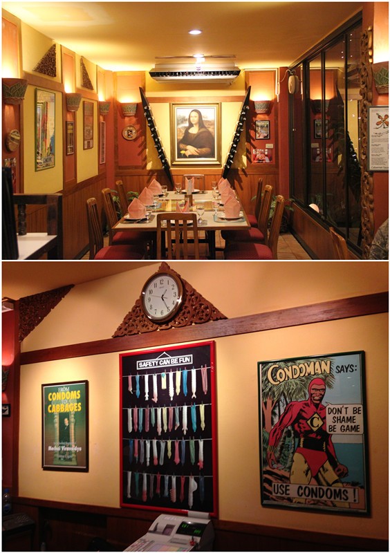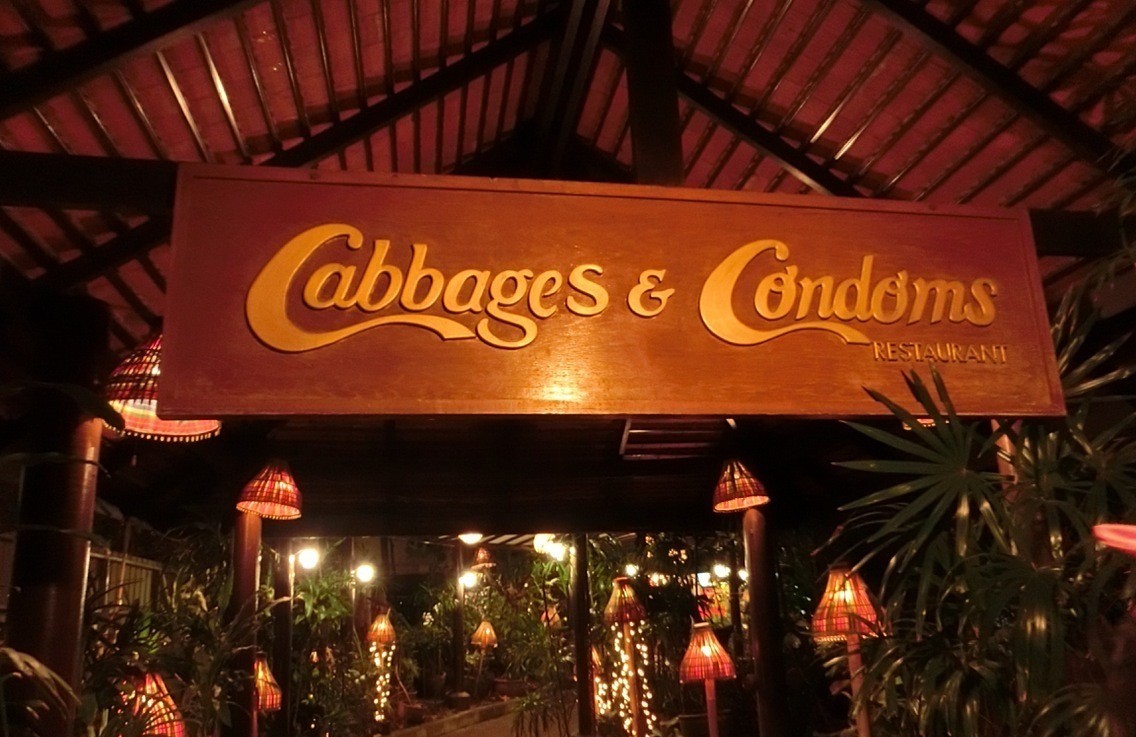 但它的的确确是曼谷一家不折不扣的餐厅,它的名字叫做“Cabbages & Condoms”(大白菜和避孕套),你可以说它是严肃正经的恶趣味,因为它的理念是:提供可口、正宗、便宜美食的同时,也为防艾提供基本的常识和保障。它坐落在曼谷Sukhumvit附近的一条小巷内,离天铁站不太远,但并不十分好找,只有喜欢冒险的人才和它有缘。