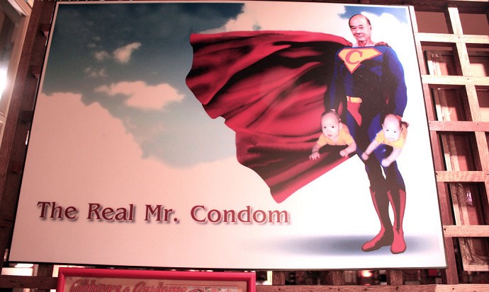 “安全套超人”就是安全套餐厅的创始人“米猜”先生,他是泰国前国家公共卫生部长,也是实力雄厚的企业家,当1984年泰国首次有了公开报道的艾滋病患者之后,他意识到安全性行为的重要性,创建了非盈利性质的组织机构“泰国人口与社区发展联合会”,这个非政府机构主要致力于计划生育和安全性行为的全国推广。之后便衍生了这样一家以安全套为主题的独特餐厅。