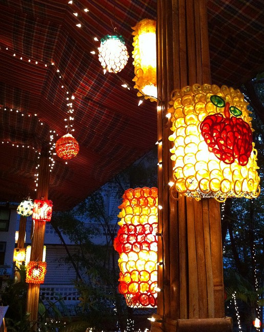 餐厅二层,柱子上装饰了形状各异五彩缤纷的彩灯,这些灯都是用安全套特别设计的,藏尽了心机。
