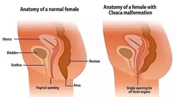 通俗地讲,就是泄殖腔畸形患者的尿道、阴道和直肠无法像常人一样分离,尿液和粪便常从一个口出来。来看一张对比图,更直观!