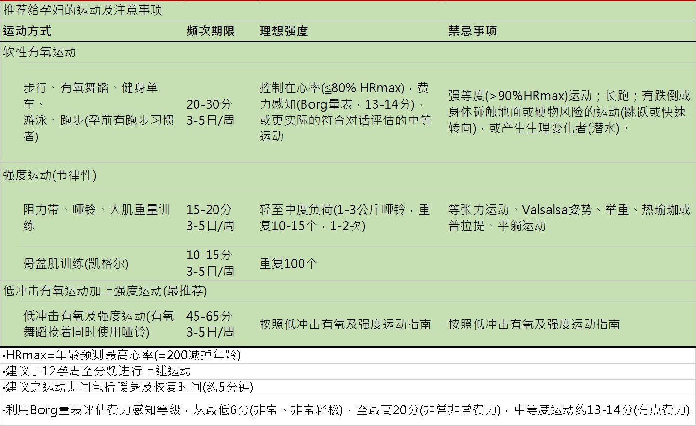 从9-11孕周到分娩,从事有氧舞蹈和中等度的肌强力运动(<70%HRmax [50-55分钟/ 次,3次/周],并不影响母体或胎儿的健康结局,包括平均孕龄,分娩方式,早产发生率,出生体重,新生儿头围,Apgar评分和脐带血pH值等。对于具备慢性高血压,妊娠糖尿病或超重/肥胖等高危险因子的孕妇,运动也被认为是安全的。