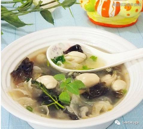 材料:水发木耳、牡蛎各100克,水发银耳50克,料酒10克,葱姜汁20克,精盐3克,鸡精2克,味精、醋各1克,胡椒粉0.5克,高汤500克。