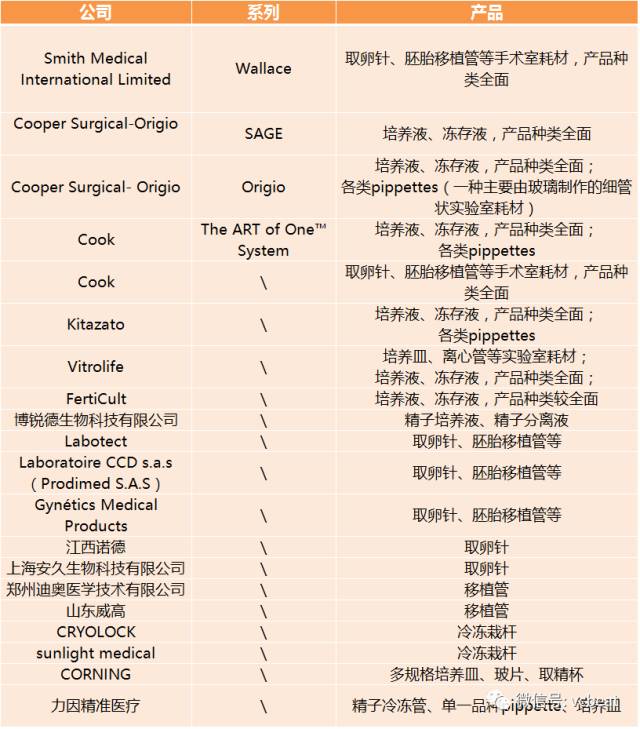 辅助生殖过程涉及的医疗器械几乎是被国外生产商如Vitrolife、William A.COOK、Origio a/s等垄断。国内的生产企业有山东威高和上海力因精准医疗等,主要生产取卵针、胚胎移植导管、培养皿等辅助生殖相关医疗器具和耗材类产品。