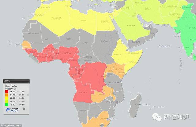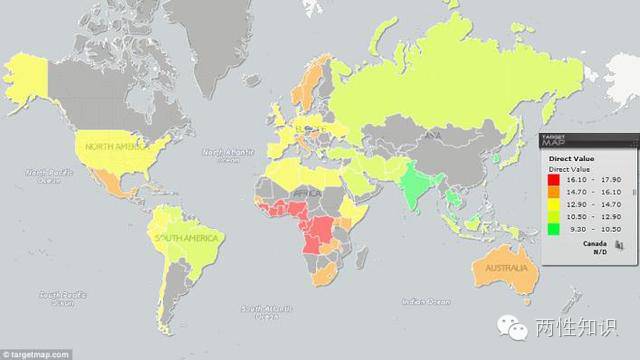男人们再也不用紧张兮兮的猜测,跟外国人比自己是大是小了,外国数据地图网站Target Map近日发表了全球男人“丁丁”尺寸分布图,非洲男人的丁丁以平均值大于16cm稳居榜首,不幸垫底的是亚洲男人。