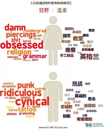 我们提了一个问题:“你理想中性爱是怎样的,狂放或是温柔?” 然后统计选择狂放或是温柔的人的个人描述,从中选出最高频出现的词语。以下分别是20岁年龄段的男性和女性的词汇云。