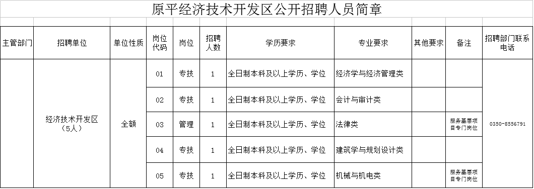 原平经济技术开发区管委会为全额事业单位,招聘名额5名。招聘的具体单位、性质、岗位、名额、资格条件等详见《原平经济技术开发区公开招聘人员简章》。