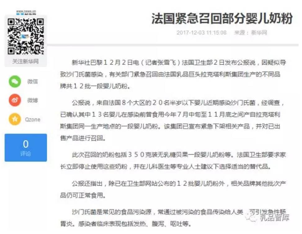 据新华社报道,法国卫生部12月2日发布公报显示,紧急召回的共包括兰特黎斯集团生产的Lait Picot SL、Pepti Junior、Milumel Bio三个品牌的一段婴儿奶粉,共计12批次。