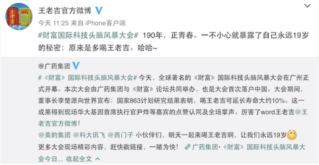 大会上广药集团董事长李楚源宣布:“国家863计划研究结果表明,喝王老吉可延长寿命大约10%。”